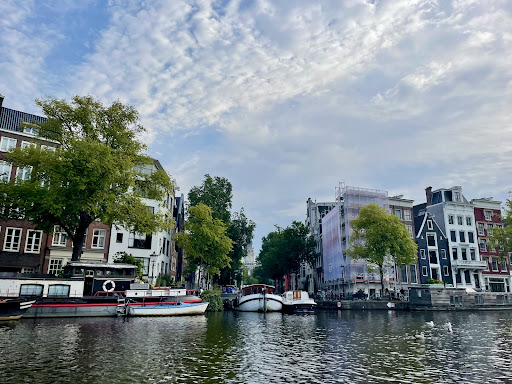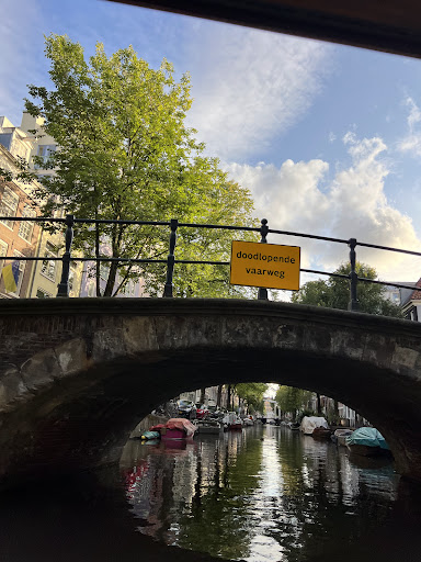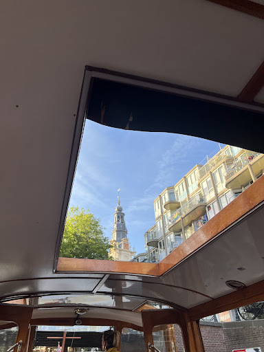 We wachten op je op de boot "Jonckvrouw" voor het Museum van de Grachten, Herengracht 124-128, SPACES gebouw, Amsterdam Centrum.