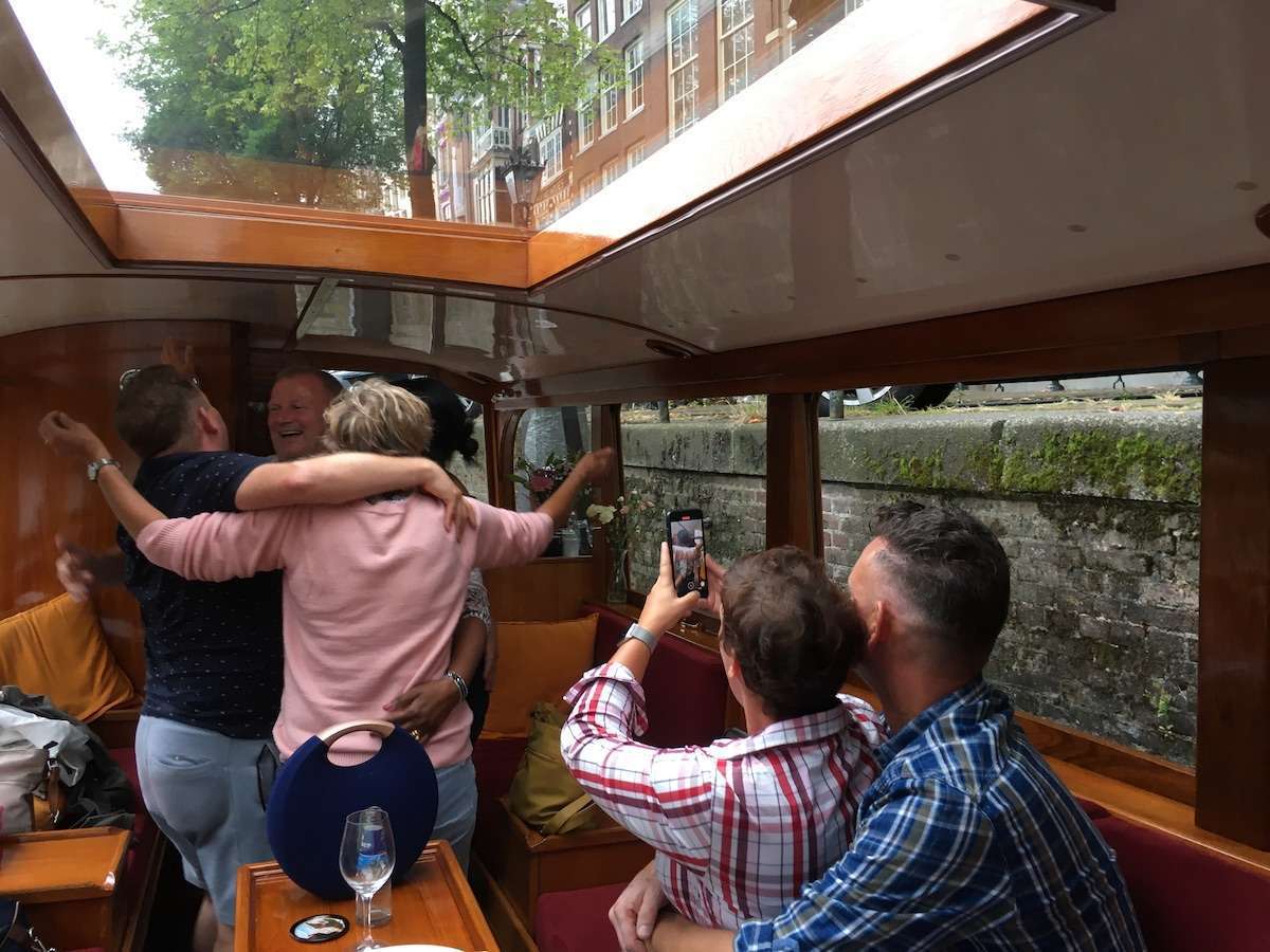 Our silent historic saloon boat is all about comfort and sails fully electric! Up to 12 guests. When the weather is nice, we open the roof and windows. When it rains, we stay dry.
