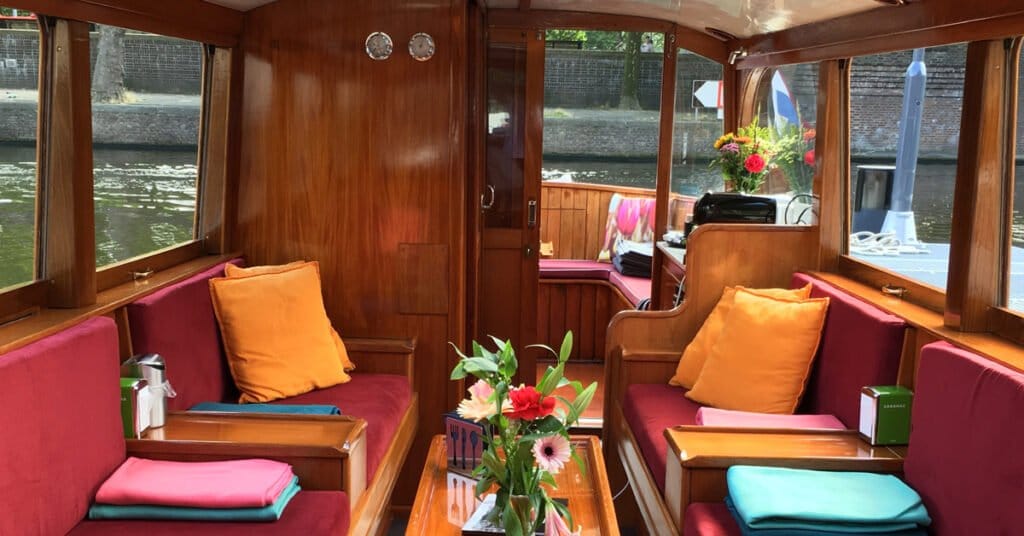 We cruise in the former Dutch government boat from 1928, which was used by Presidents, Mayors, and the Royal Dutch royal family.